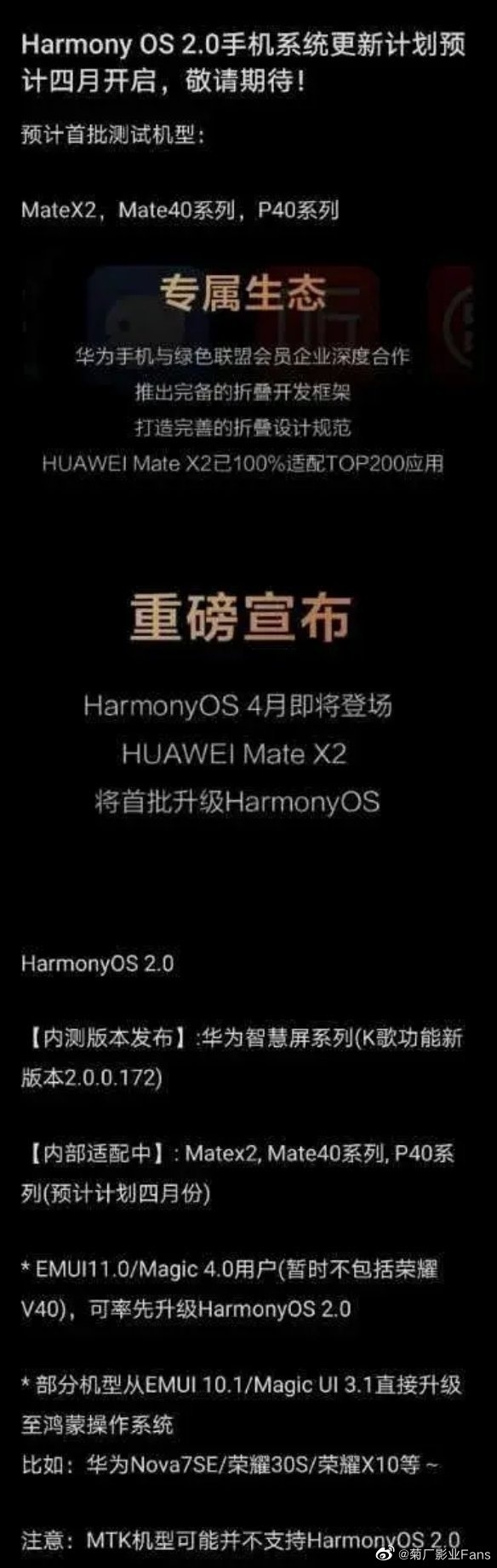 首批机型敲定为Mate X2、Mate 40系列、P40系列。