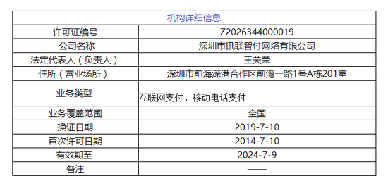 央行官网信息显示,2014年7月,深圳市讯联智付网络有限公司获得支付牌照,业务类型为互联网支付、移动电话支付、数字电视支付,覆盖范围为全国。最新信息显示,目前业务类型仅为互联网支付、移动电话支付,有效期至2024年7月。