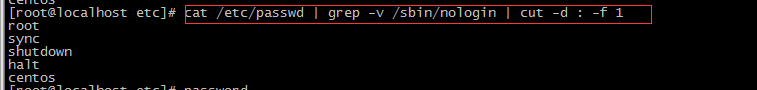 cat /etc/passwd | grep -v /sbin/nologin | cut -d : -f 1