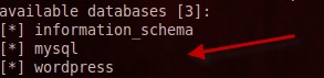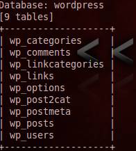 发现三个数据库,接下来通过参数”-D wordpress -tables”来查看wordpress数据库的所有表名