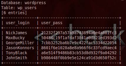 接下来猜解字段user_login和user_pass的值.用参数”-C user_login,user_pass–dump”