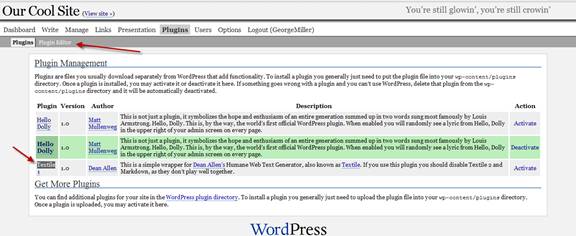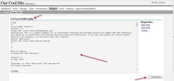 尝试上传php webshell到服务器,以方便运行一些linux命令.在插件页面寻找任何可以编辑的插件.我们选择Textile这款插件,编辑插入我们的php webshell,点击更新文件,然后访问我们的phpwebshell.