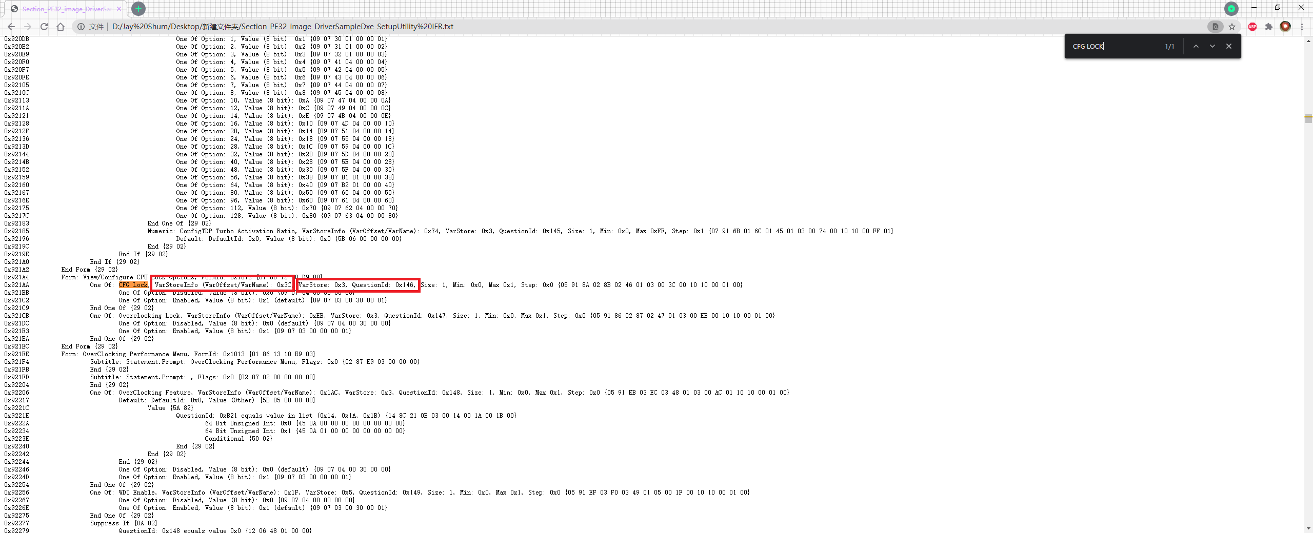 打开IRFExtractor导出的文本文档,搜索BIOS相关设置项,如”CFG LOCK”(大文本用浏览器打开比记事本快)