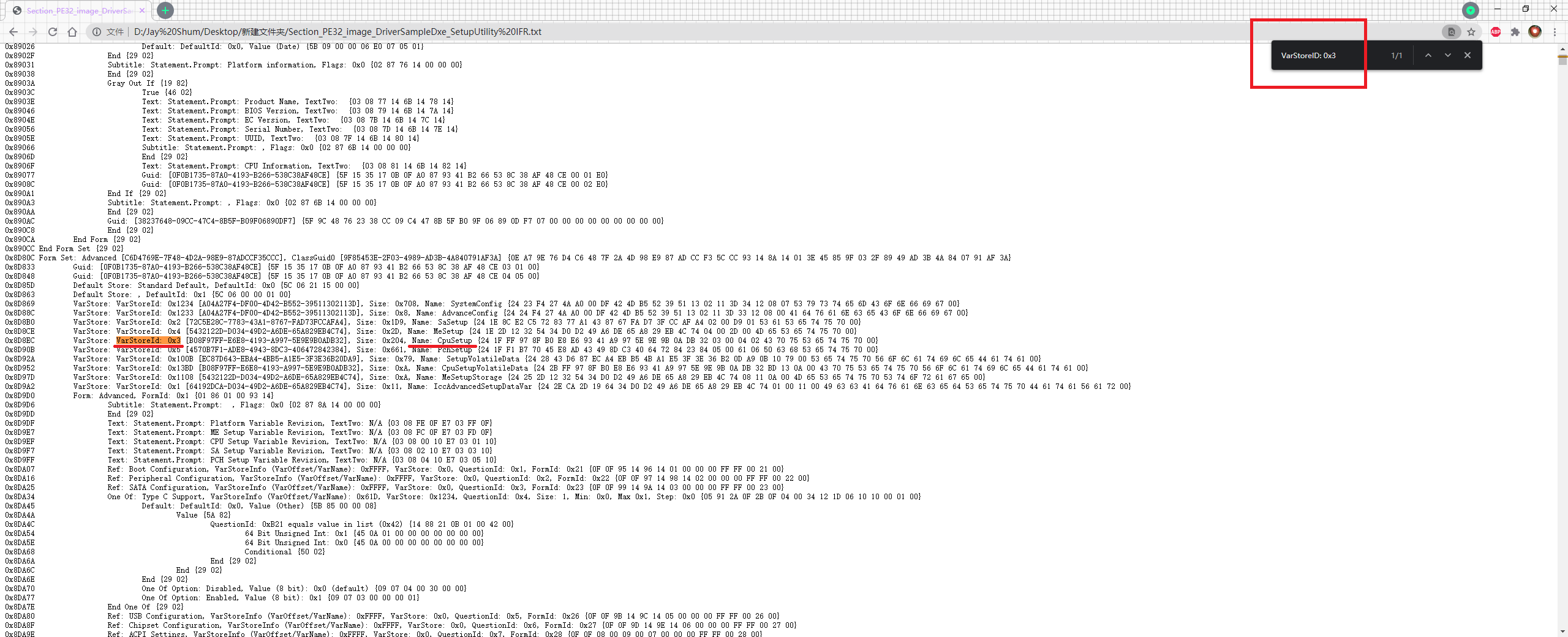 搜索偏移集“VarStore: 0x3”,VarStore加ID,即搜索“VarStoreID: 0x3”,搜出偏移集名称