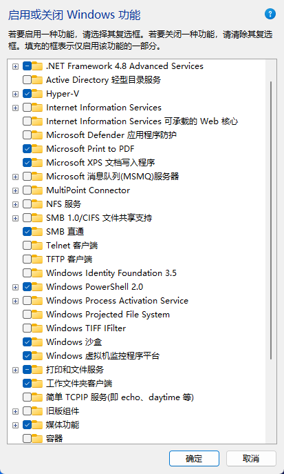 1、首先在Windows搜索框中输入启用或关闭Windows功能,并打开,然后勾选Hyper-V、Windows沙盒、Windows虚拟机监控程序平台、虚拟机平台四项打勾,点击确定,如果电脑提示需要重启,则先进行重启,再进行下一步。