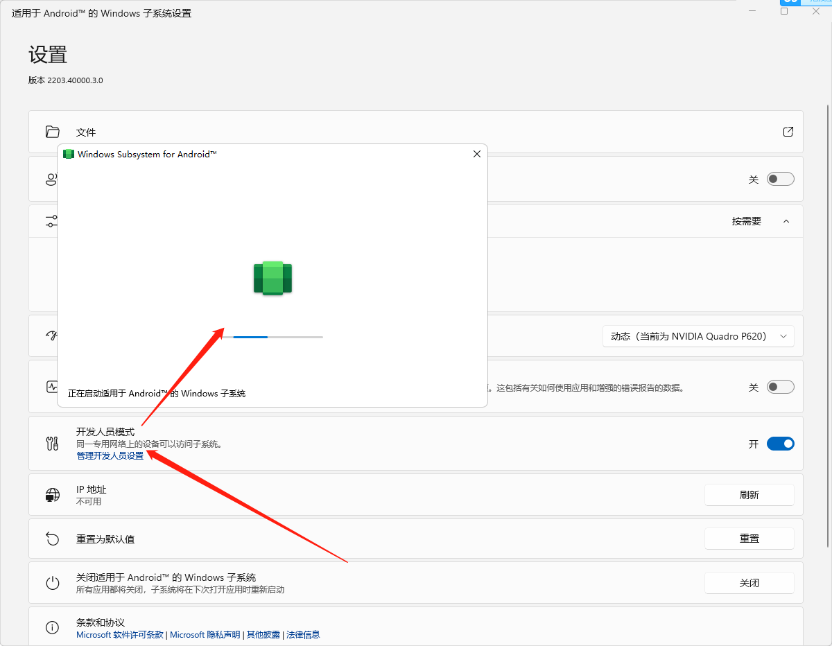 如果是上图显示IP地址不可用,点击开发人员模式下面的管理开发人员设置,等wsa弹出框出现,然后关闭重新打开was,即可看到IP地址,如下图