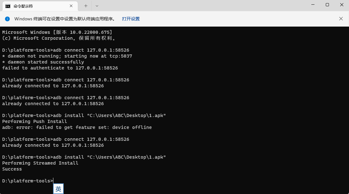 命令:adb install “C:\Users\ABC\Desktop\1.apk” (引号内为apk路径)