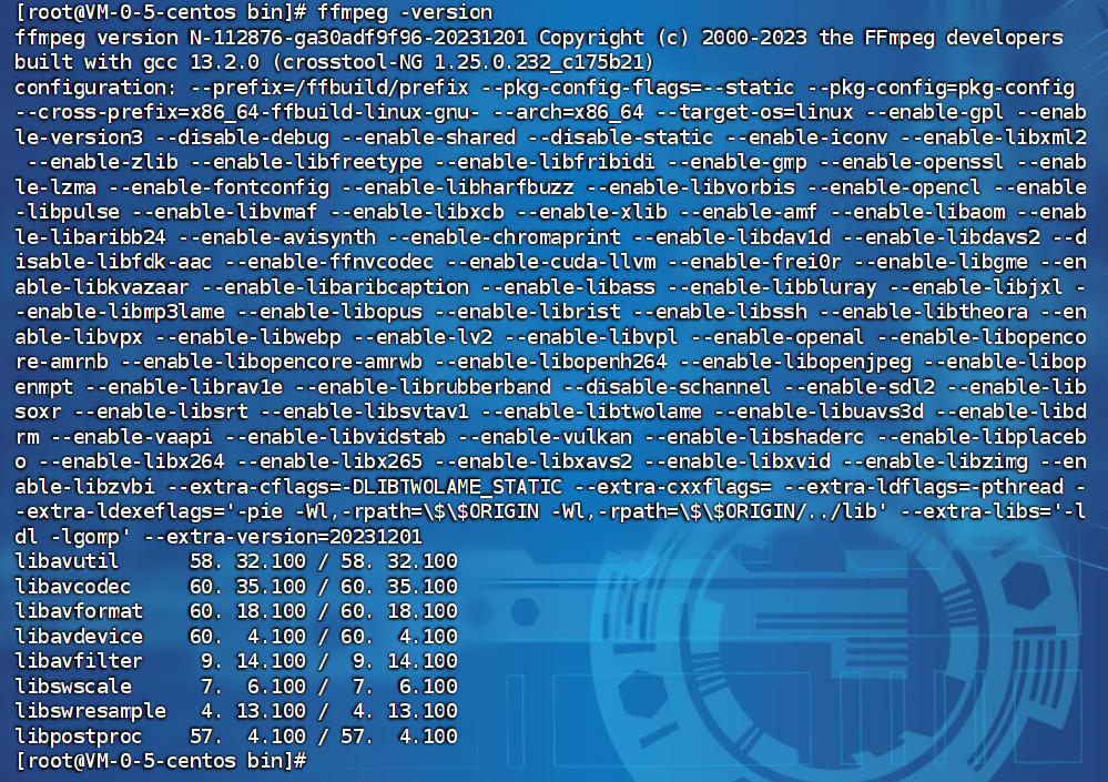 安装完成后,我们可以在命令行输入:ffmpeg -version,来查看安装是否成功。如果成功,则会出现下图的FFMPEG版本信息。